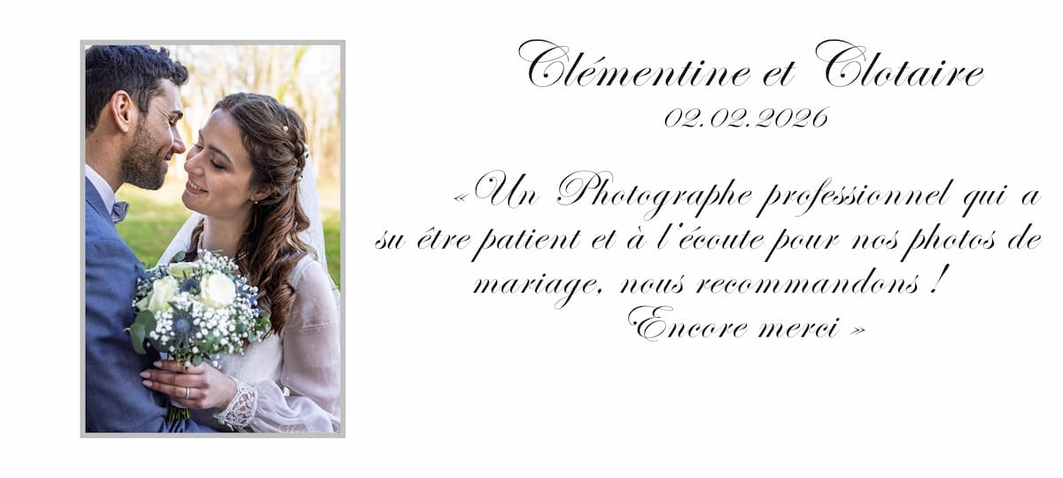 Oui, je prends le temps de visiter chacun des lieux où se déroulera votre mariage : lieu de culte et mairie pour les cérémonies, parc ou espaces extérieurs pour les séances photos, ainsi que le lieu de réception pour le vin d’honneur et les festivités.